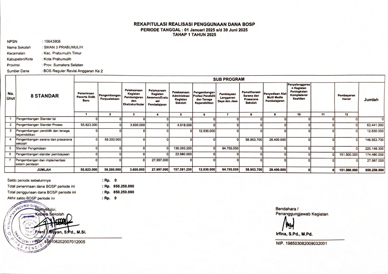REKAPITULASI REALISASI PENGGUNAAN DANA BOSP TAHUN 2025