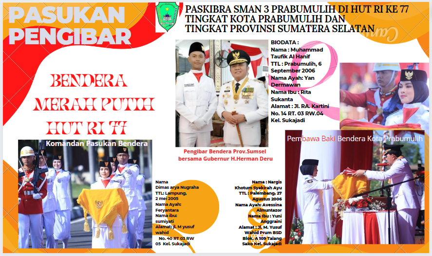 Syukur tak terhingga Salah satu siswa terbaik SMAN 3 Prabumulih menjadi Paskibraka Tingkat Provinsi atas nama Muhammad Taufik Al Hanif dari kelas XI IPA. Sosok Taufik yang santun dan berkarakter disiplin membawanya terpilih sebagai Paskibra Provinsi. Prestasi yang mengharumkan KOta Prabumulih di tingkat Provinsi Sumatera Selatan, taufik bercita cita menjadi Pasukan Elit Tentara Nasional Indonesia