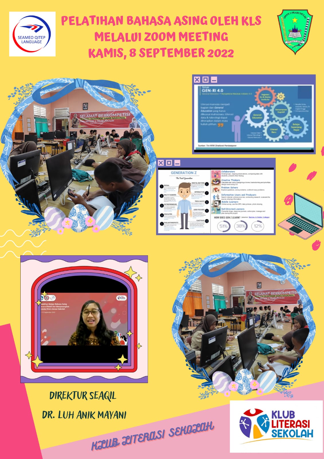 DI hadiri oleh Direktur SEAMEO ((Southeast Asian Ministers of Education Organization) Regional Center for Quality Improvement of Teachers and Education Personnel (QITEP) in Language (SEAQIL). Dr Luh Anik Mayani, Dilanjutkan dengan pemaparan materi basic. Alhamdulillah kegiatan berjalan dengan lancar pelatihan akan berlangsung hingga tanggal 13 september,. Peserta klub Literasi sebanyak 30 orang dari kelas x dan kelas xi. mereka antusias mengikuti kegiatan dan menimba ilmu.