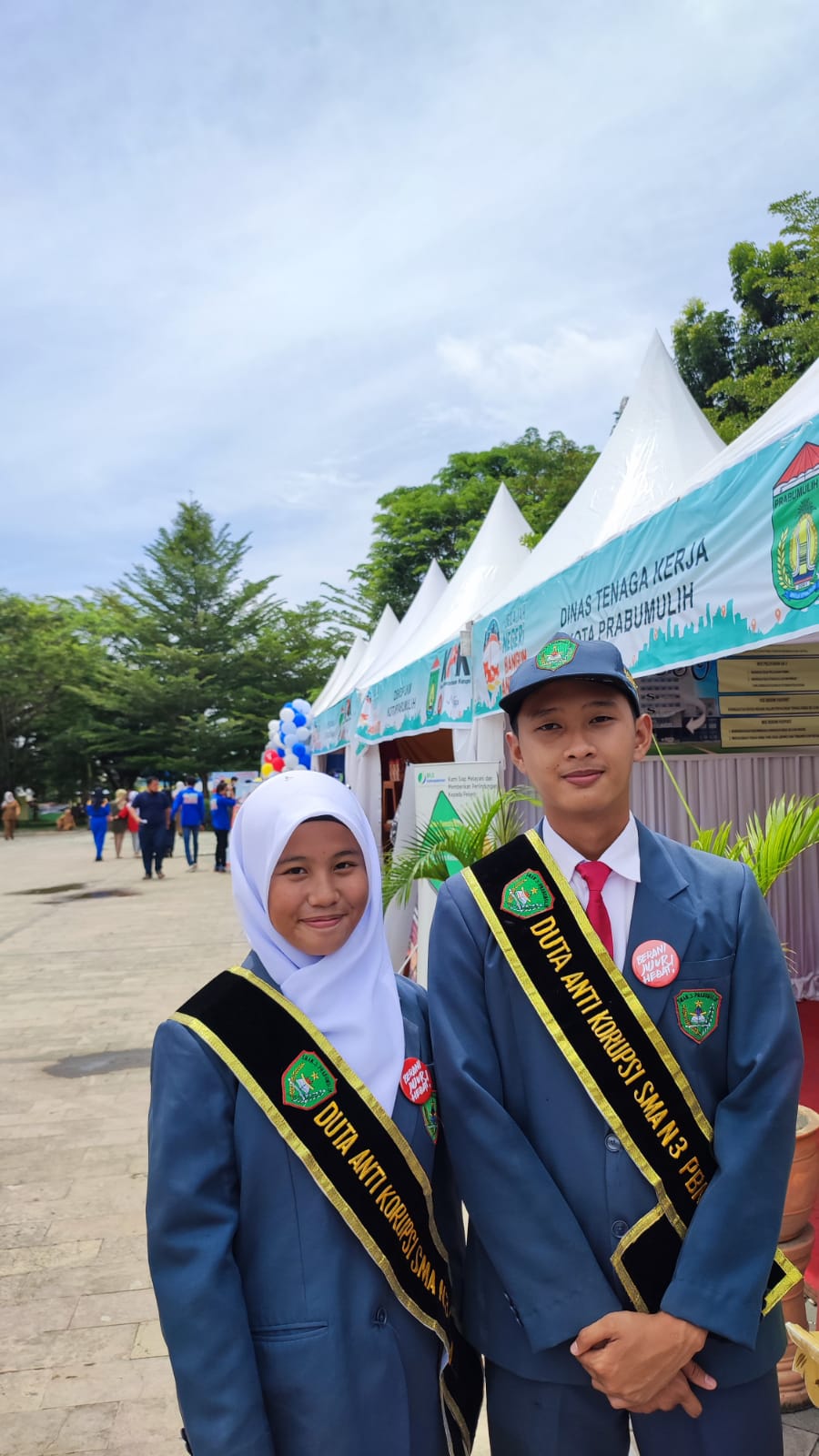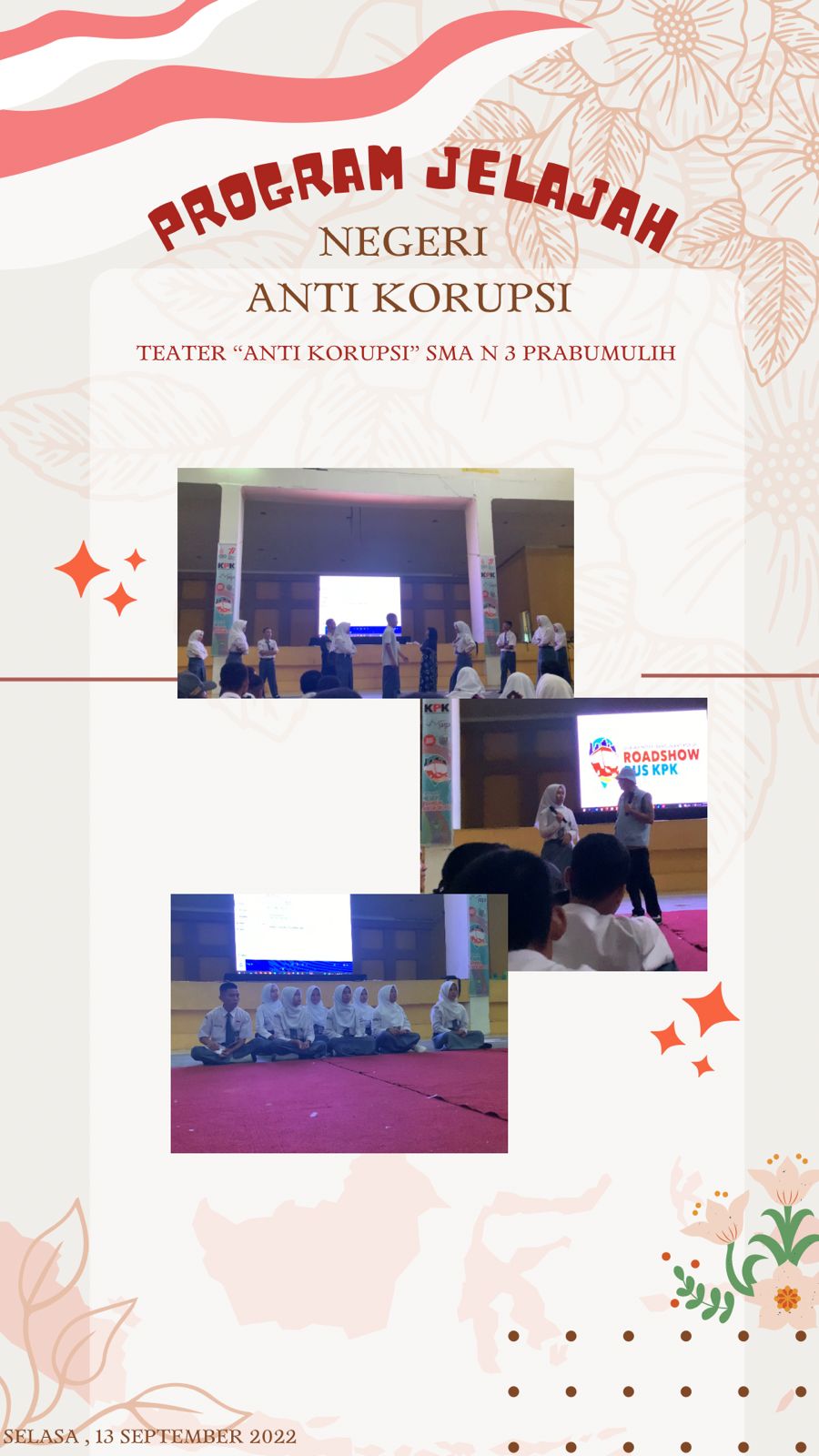 SMA NEGERI 3 PRABUMULIH dengan Klub Teaternya, Didukung penuh oleh Kepala sekolah Feni Listiyan S.Pd.,M.Si. turut andil dalam mengisi kegiatan RoadShow Bus KPK dengan Tema anti korupsi (Dracil drama Kecil anti korupsi) yang Menceritakan tentang bendahara kelas yang terpaksa menggunakan uang kas utk membayar biaya pengobatan orang tuanya.