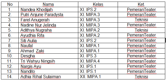 Drama Kecil Anti Korupsi ini di Sutradai oleh Pembina Teater Ibu Anggi Dwi Pertiwi S.Pd dan mengikut sertakan 11 aktris dan aktor siswa, dan 3 teknisi. diikuti oleh 2 kelas siswa sebagai peserta suporter Juga Di dampingi oleh Waka Keiswaan Deny Trisna S.Psi.