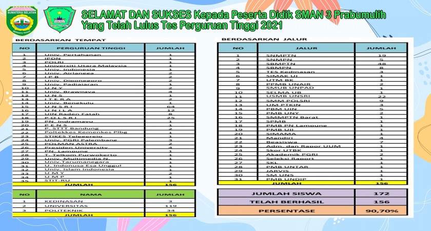 Selamat dan Sukses atas 156 Siswa SMAN 3 Prabumulih lulus Perguruan Tinggi Negeri