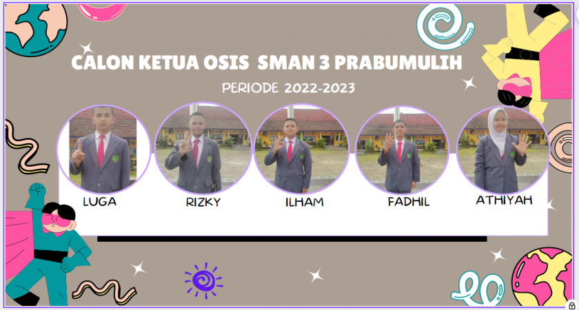 Kegiatan sosialisasi dan pengambilan no Urut Calon Ketua Osis SMAN 3 Prabumulih di hadiri oleh Ibu Kepala SMAN 3 Freni Listiyan, S.Pd.M.Si, Wakasis. Deny Trisna S.Psi. Jajaran Pembina Osis serta Seluruh Wakil Kepala Sekolah dan Dewan Guru beserta staf Tata Usaha. disaksikan oleh seluruh Murid SMAN 3 Prabumulih (NN, 5/9/2022)
