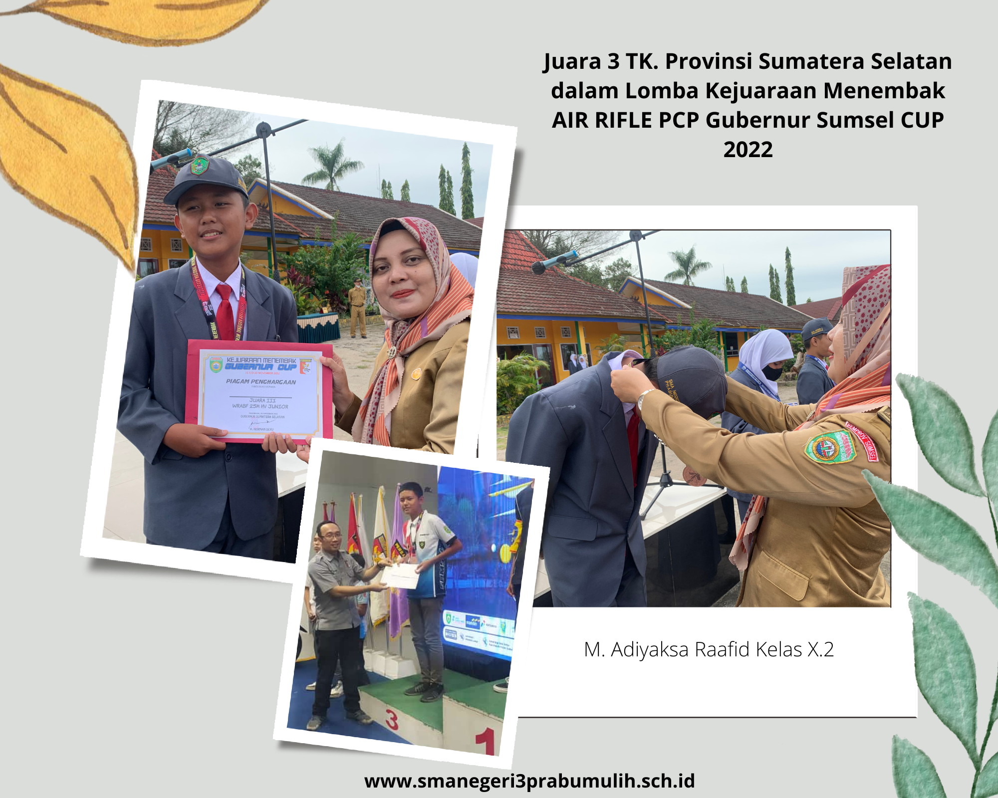Dan siswa SMA Negeri 3 Prabumulih Meraih Juara 3 TK. Provinsi Sumatera Selatan dalam Lomba Kejuaraan Menembak AIR RIFLE PCP Gubernur Sumaatera selatan CUP 2022 atas nama : M. Adiyaksa Raafid Kelas X.2